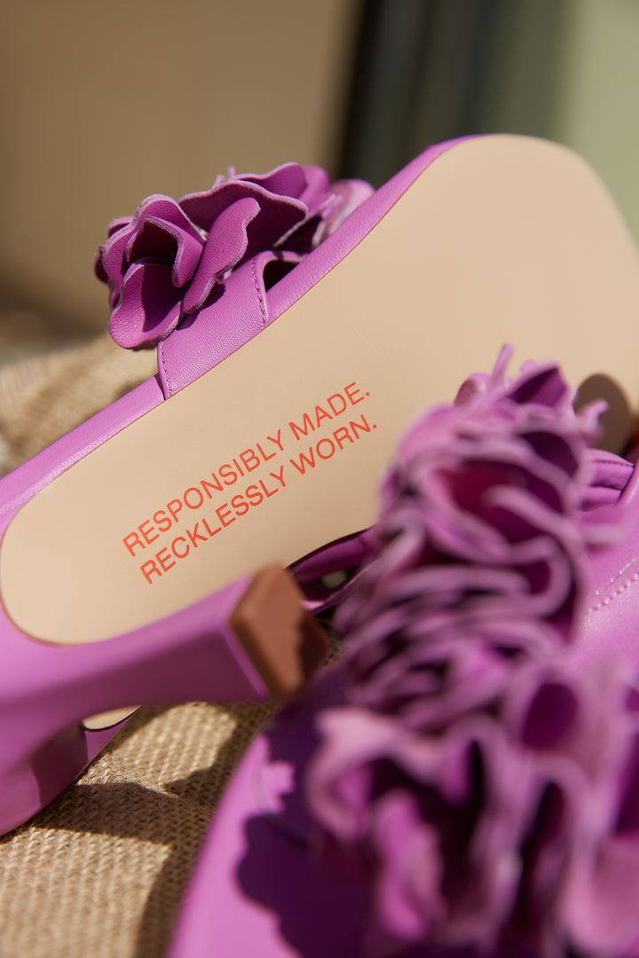 The Florist in Very Violet is a bold purple mid heel sandal with a soft leather toe thong strap and recycled outsole. This chic dress sandal pairs perfectly with wedding guest outfits, garden parties, or a casual date night look. A comfortable memory foam insole makes it your go-to purple summer heel for dancing and dressing up sustainably.