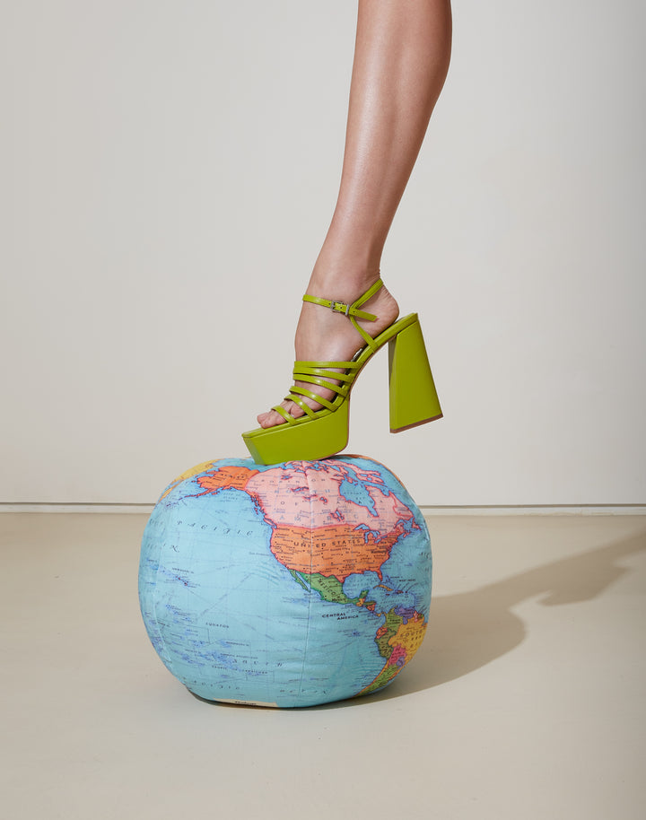 Perfect for weddings, parties, and statement looks, the Honeymoon Platform Sandal in Citrus is a bold green leather high heel with recycled materials. This strappy platform heel pairs easily with dresses, jeans, or your favorite festival outfit. Sustainable platform sandals for women who love to stand tall, stand out, and stand for the planet. Make a statement.