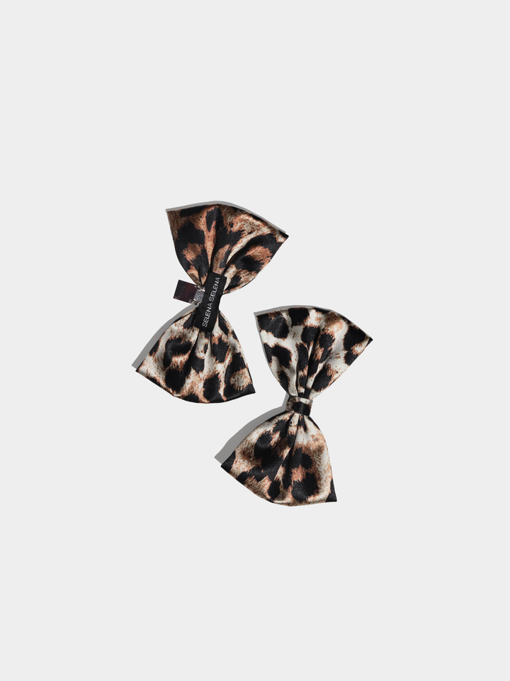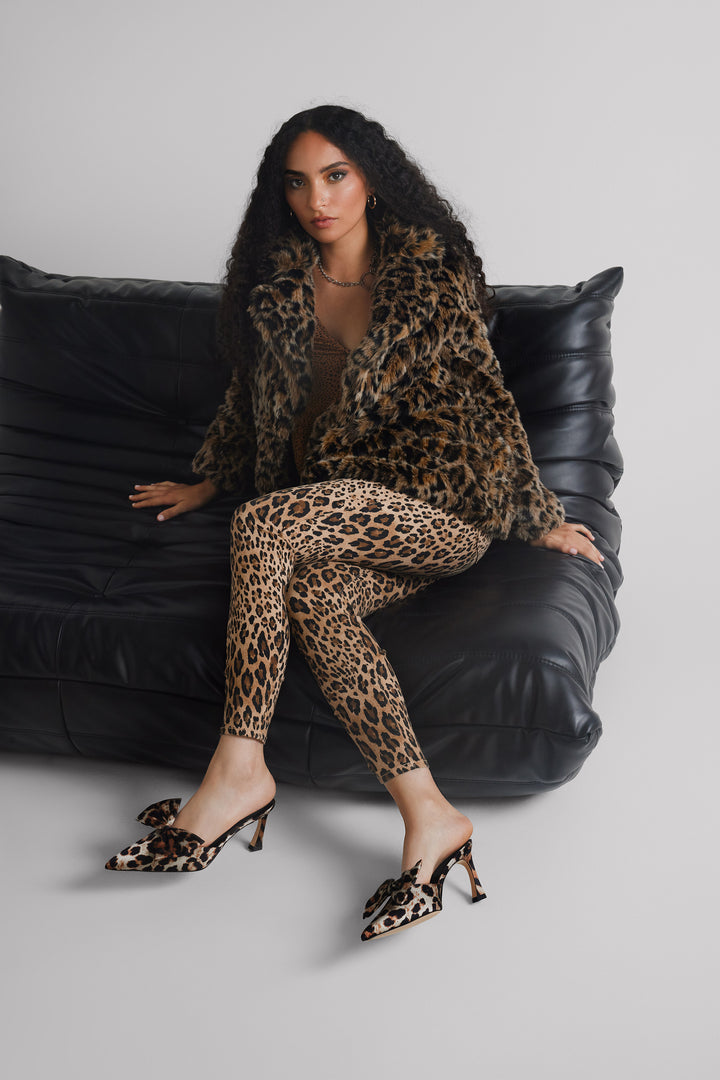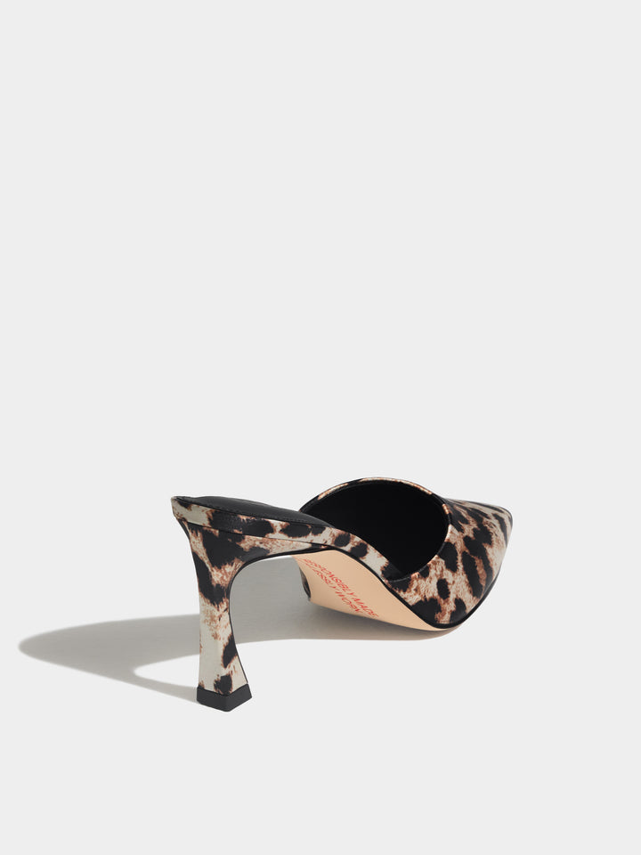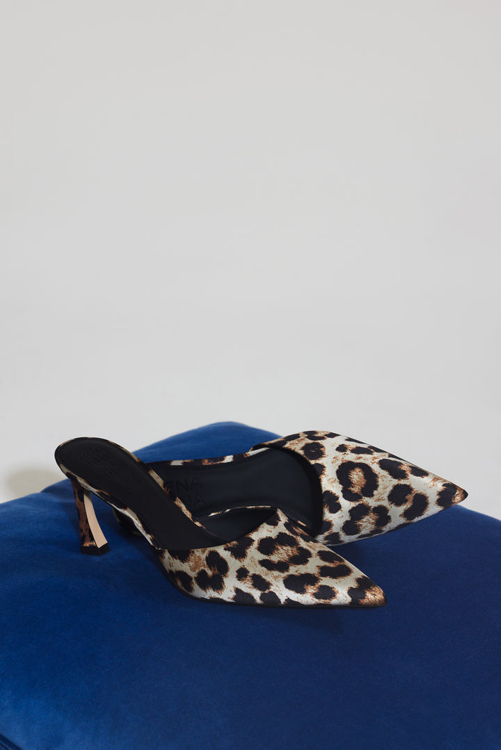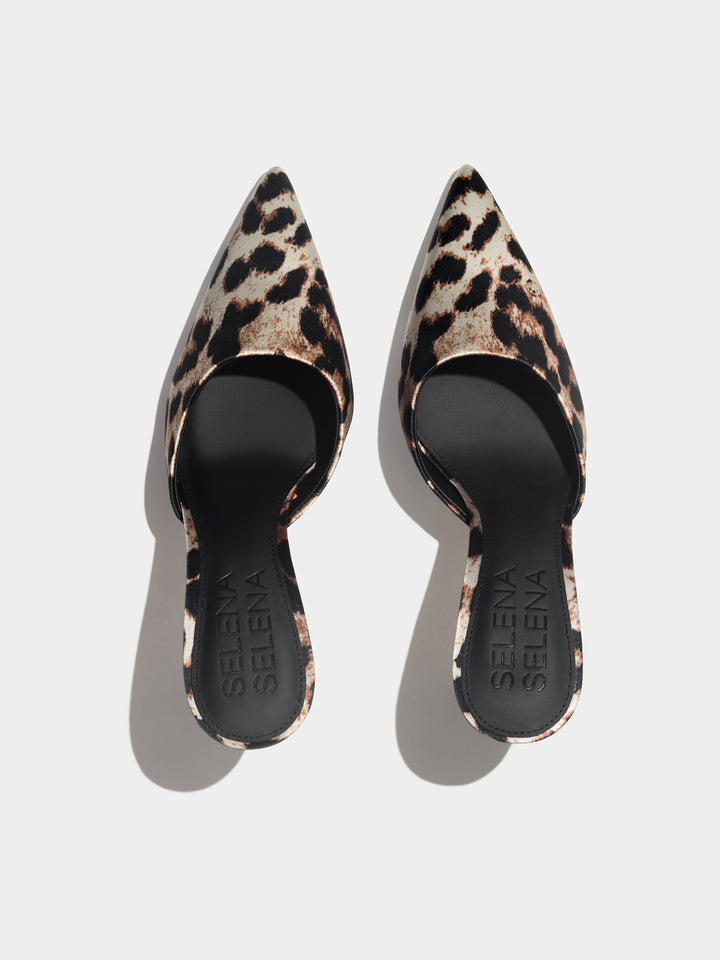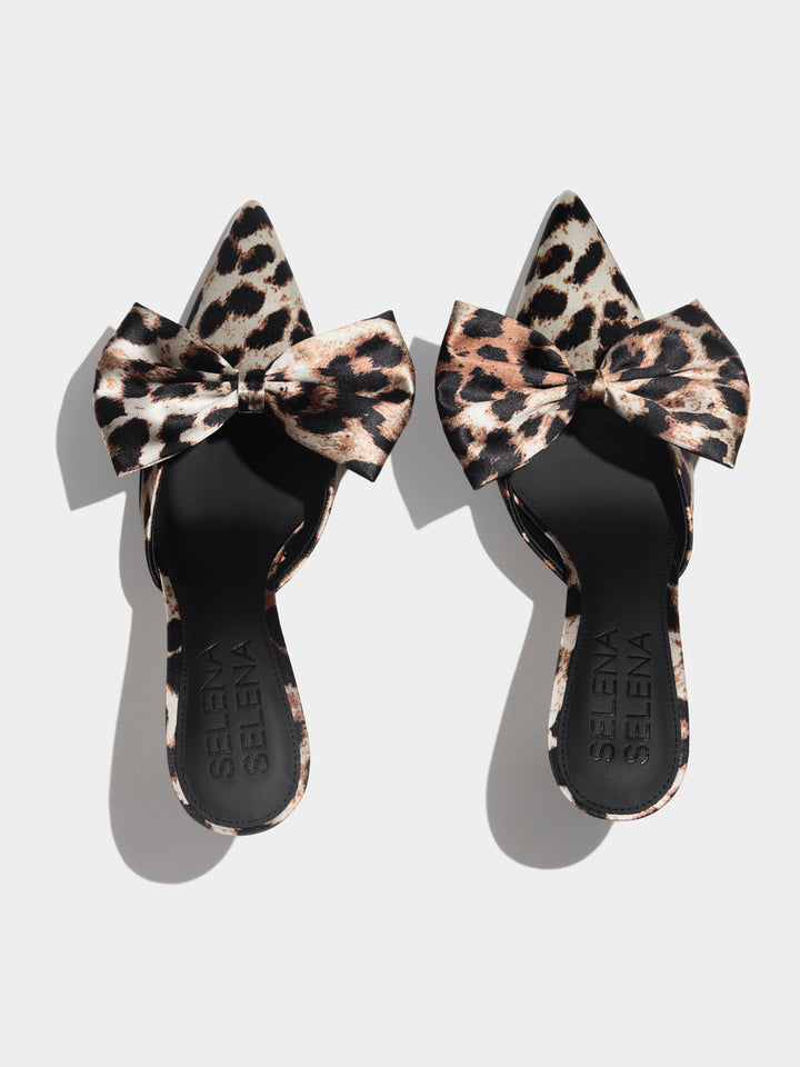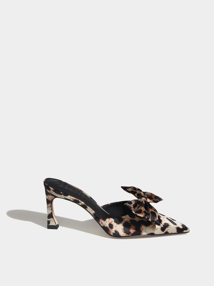 The Vixen Bow Mule in Leopard Satin is a striking pointed-toe mid heel crafted in soft leather with a removable oversized bow. Designed with a sculpted silhouette and memory foam insole, this bold mule transitions effortlessly from day to night. Pair it with cocktail dresses, holiday outfits, or even denim for a statement look. The detachable bow lets you style it your way. Wear it on the shoe, in your hair, or on a bag. Finished with a recycled outsole, it’s your go-to party heel for standing out sustainably.